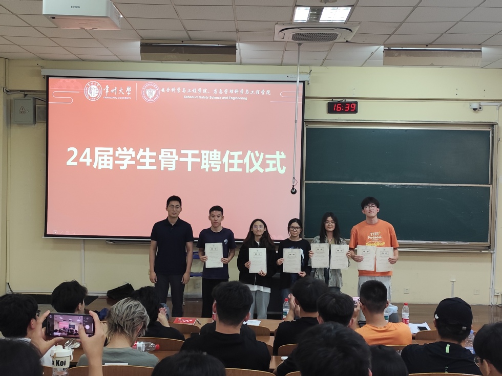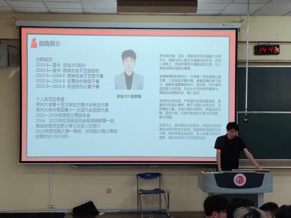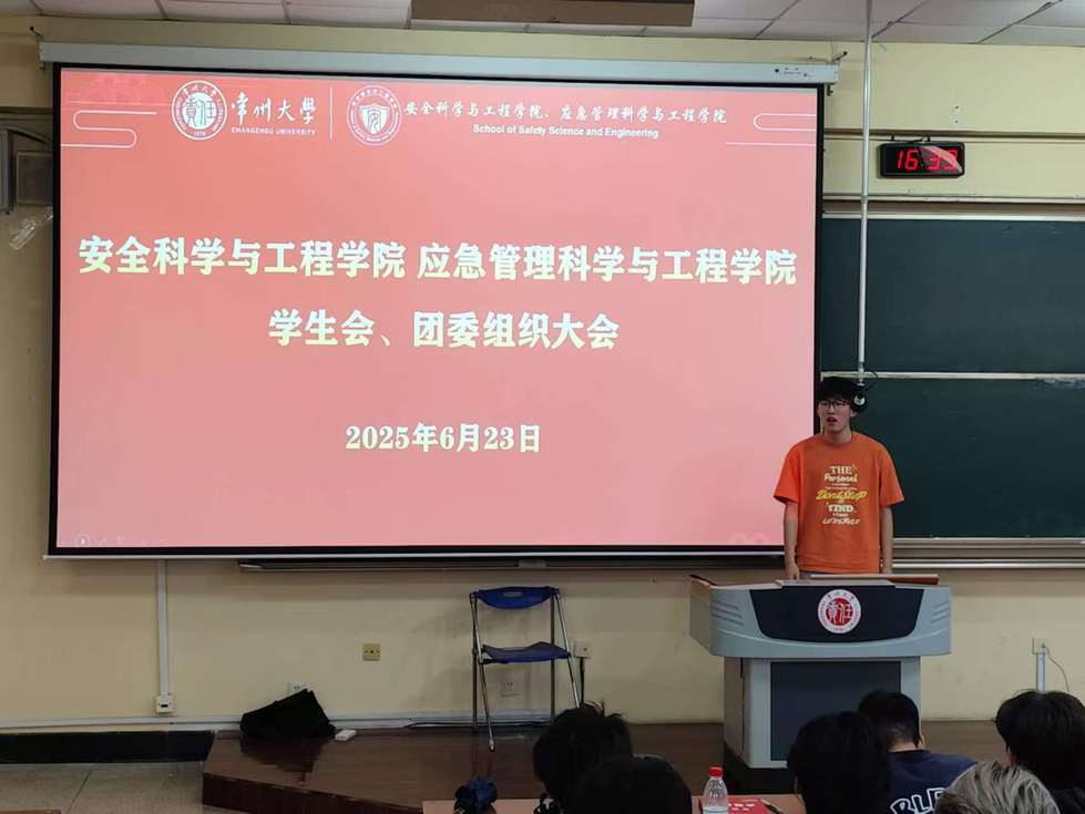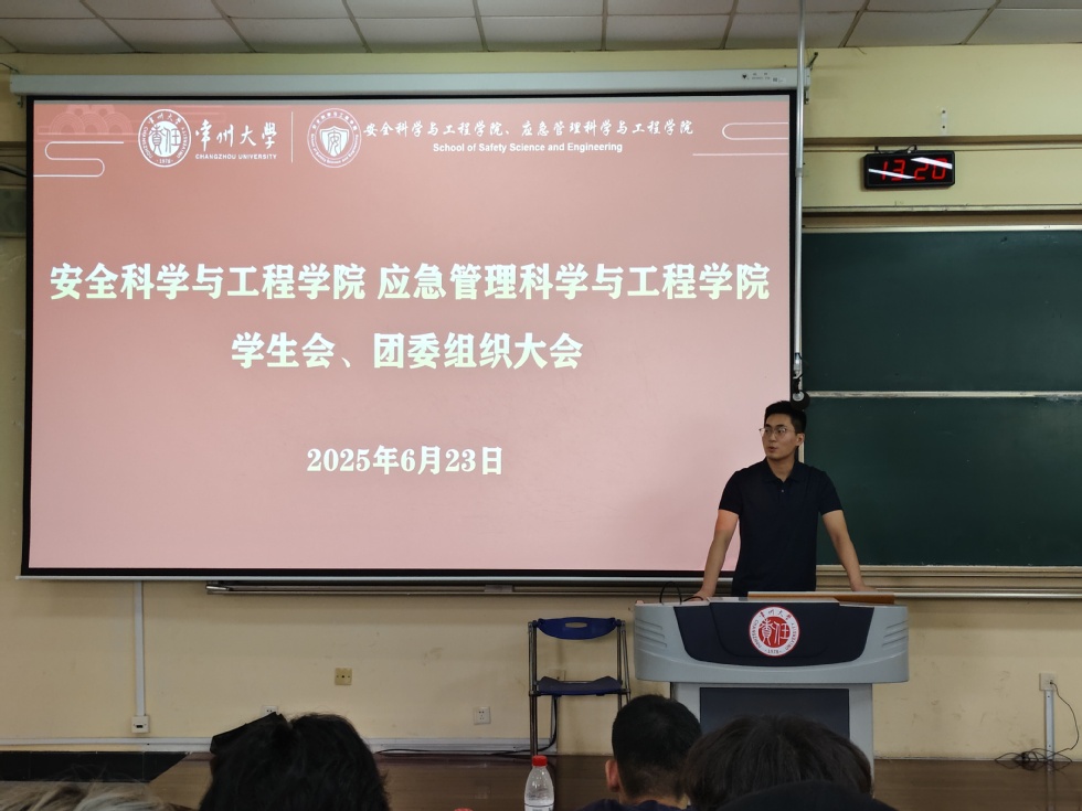 为进一步加强学生组织建设,保障学院学生工作的有序开展,6月19号晚,常州大学安全科学与工程学院、应急管理科学与工程学院学生会、团委组织大会在w4阶梯教室举行。本次大会涵盖学生会、团委部长换届,学生会主席、团委团副换届选举,院安学社社长选举,以及 24 届学生会骨干学生聘任仪式,辅导员王加栋、各大组织成员及众多学生代表共同参与了此次会议。