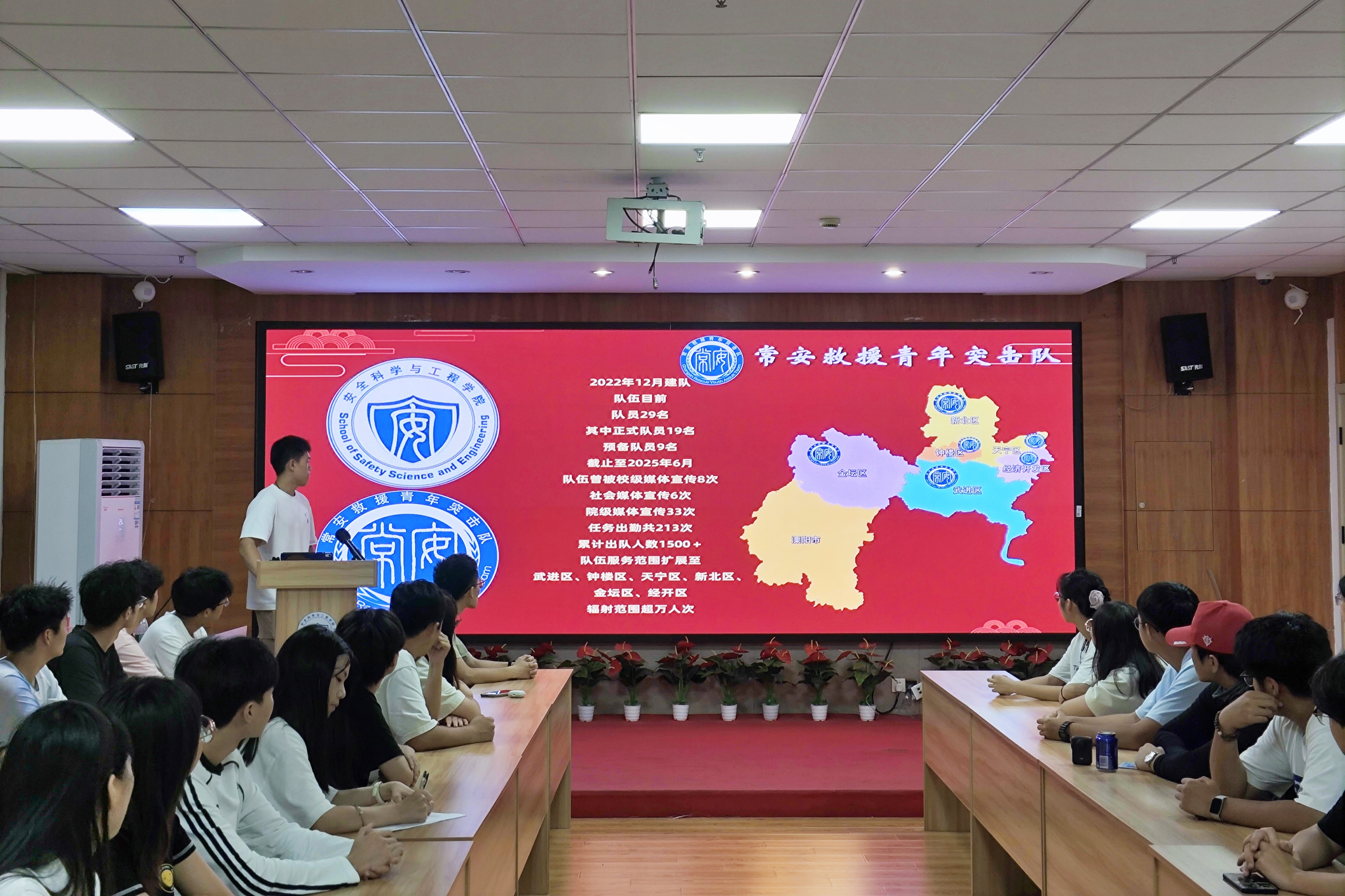 2025年9月28日晚上,常安救援青年突击队于常州大学科教城校区逸夫楼516教室举行新队员入队仪式暨老队员退队仪式,旨在加强队伍建设,增进新成员对队伍的了解。队伍指导老师周婷婷和全体新老队员参加了活动。