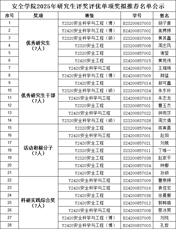 安全学院2025年研究生评奖评优单项奖拟推荐名单公示