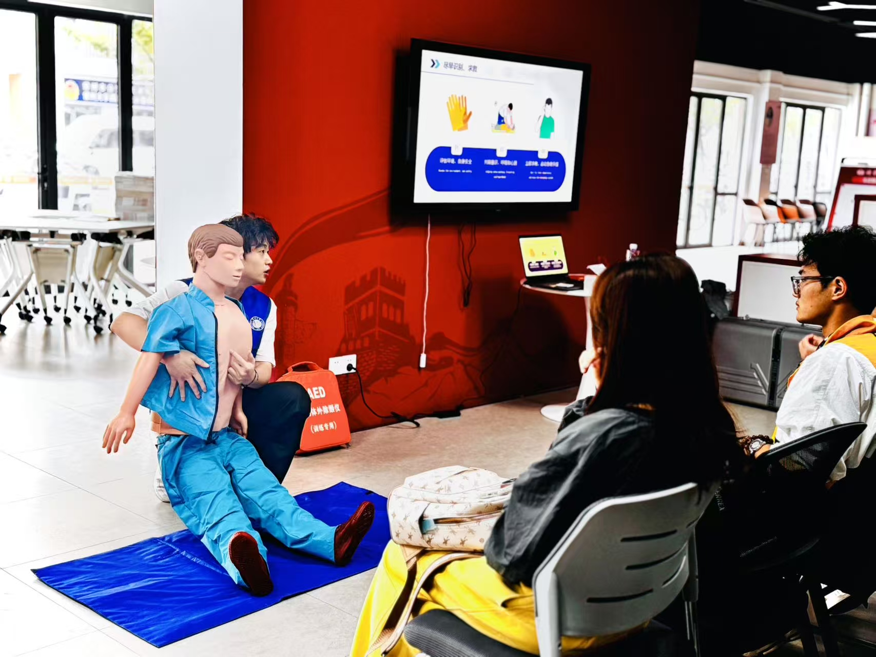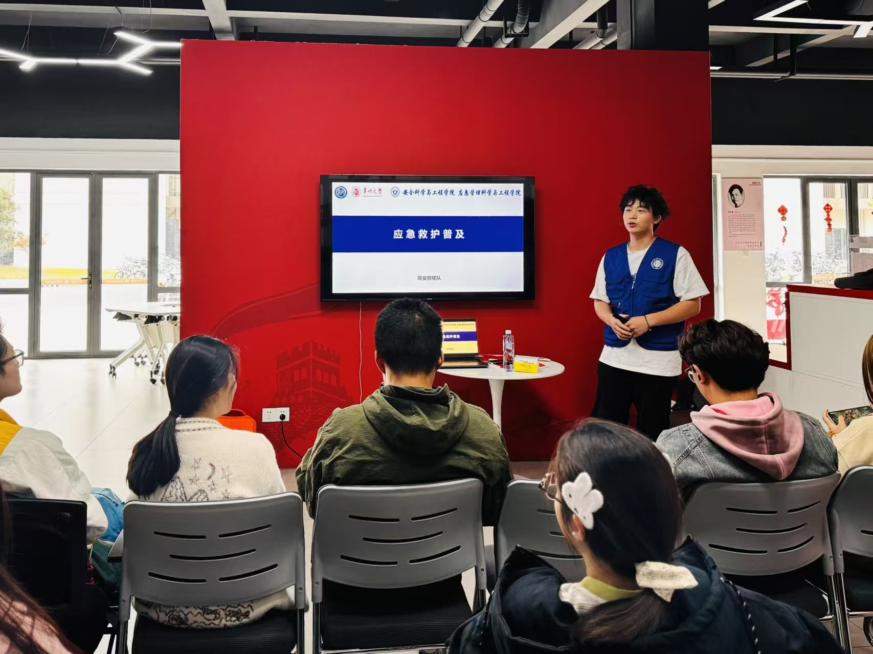 培训由副队长曹忆源带队,重点讲解心肺复苏(CPR)与海姆利克急救法两项内容。主讲人首先介绍了队伍的服务宗旨与实践经验,随后结合生动比喻,逐步演示关键操作,并通过全流程实操加深理解。主讲人强调,“生命至上”是应急救护的核心原则,任何操作都须规范严谨,避免失误。