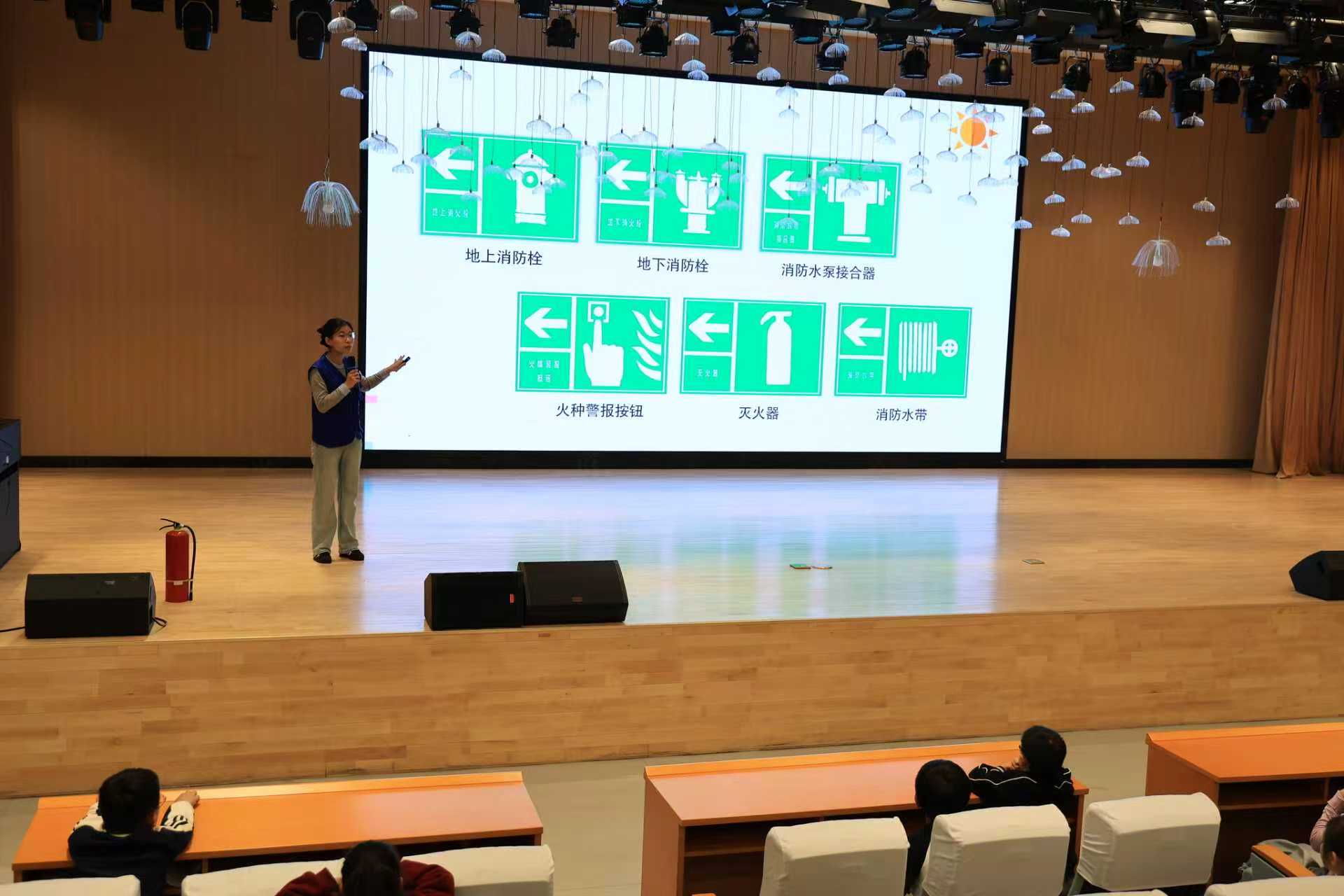 当天14时,突击队队员准时抵达学校大礼堂。在全体师生共同完成消防模拟逃生演练后,消防安全知识讲解环节正式拉开帷幕。在讲解灭火器使用方法时,队员们将操作流程凝练为“提、拔、握、压”四字口诀,通过现场演示与分步讲解相结合的方式,清晰呈现每一个关键动作,帮助同学们迅速掌握正确操作技巧。随后,队员们展示了各类常见消防标识,并采用问答形式与师生积极互动,引导大家辨识标识含义及应用场景。同学们踊跃分享日常生活中观察到的消防标识,在交流中加深理解、强化记忆。活动最后,队员们对讲解内容进行了系统梳理,通过提问复盘的方式,帮助师生巩固灭火器使用要点和消防标识知识,确保学习内容入脑入心。